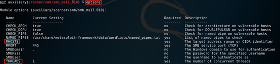 在此,只关注两个命令:RHOSTS和THREADS,RHOSTS是要扫描的主机(主机段),THREADS是线程,默认是1,开始使用线程加快扫描