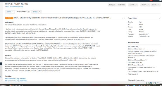3.本次实验还可以用到Nessus对靶机系统进行扫描,确认有无永恒之蓝漏洞