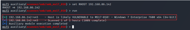 5.设置攻击地址,并run运行,提示貌似存在永恒之蓝漏洞(MS17-010)