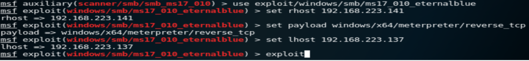 auxil iary/ scanner/ smb/ smb/ms17010为扫描模块,用于对目标是否存在永恒之蓝漏洞进行确认exploit /wi ndows/ smb/ms17 010 eternalblue为攻击模块,用于对存在永恒之蓝漏洞的目标进行攻击