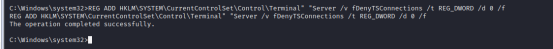 REG ADD HKLM\SYSTEM\CurrentControlSet\Control\Terminal" "Server /v fDenyTSConnections /t REG_DWORD /d 0 /f2打开被攻击主机远程登录端口8.在kali中使用