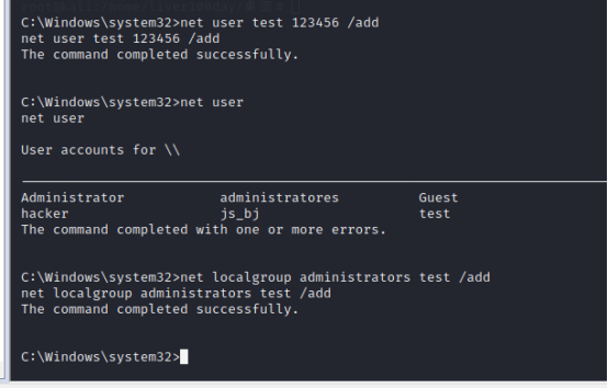 net user test 123456 /add 创建test用户,密码为:123456net localgroup administrators test /add 将test用户拉入管理员组,提升为管理员用户7.使用
