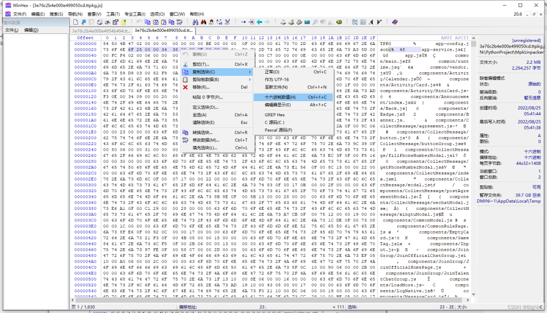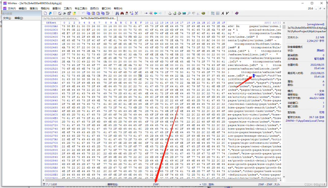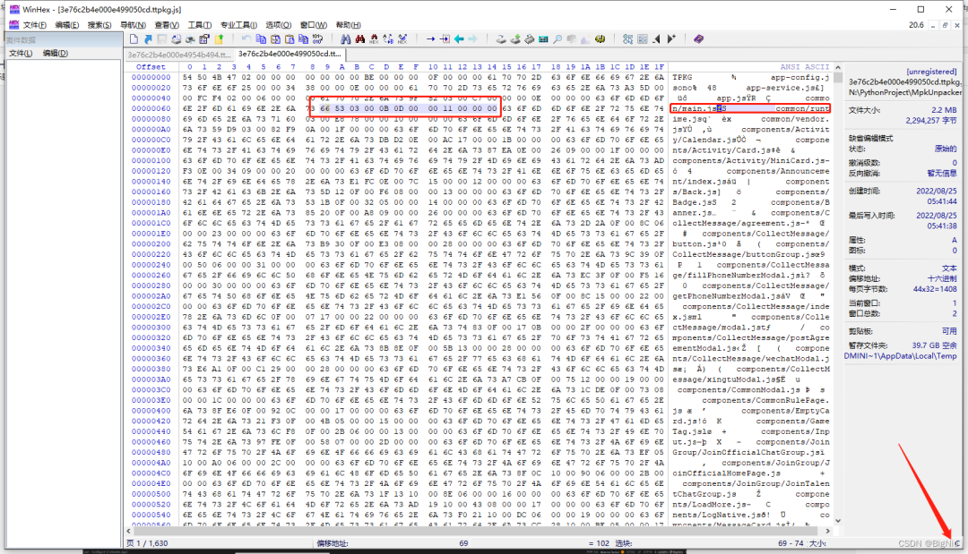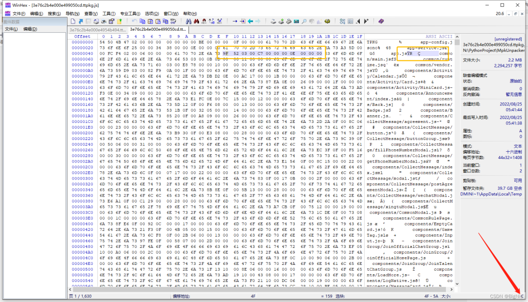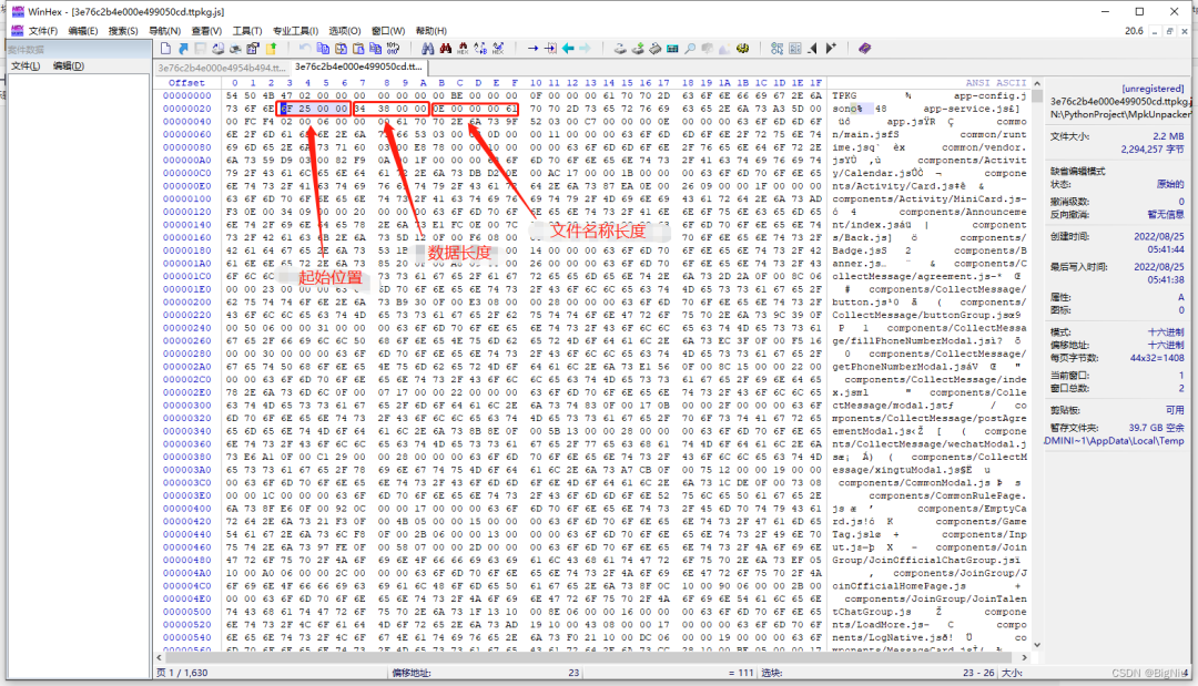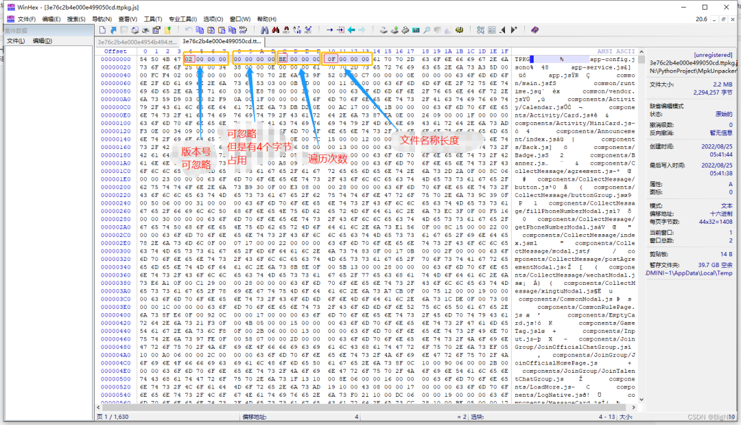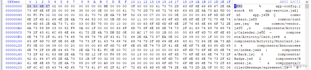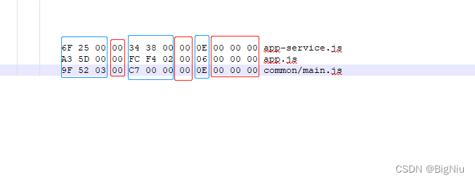 int类型占用四个字节,'app-service.js'的长度为14,所以对应的16进制为E,'app.js'的长度为6,在16进制里也就是'6',这里定位了文件名称长度的位置,就是每段空白字符的第9-12个字节,因为使用的是大端存储的,所以是逆序的,大端存储和小端存储可以百度一下。