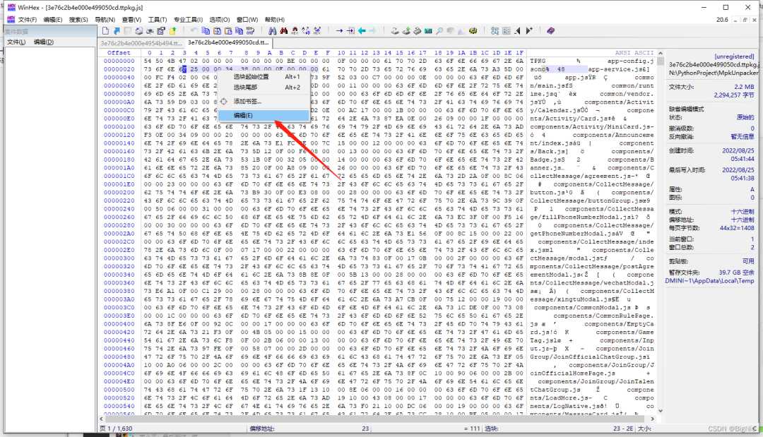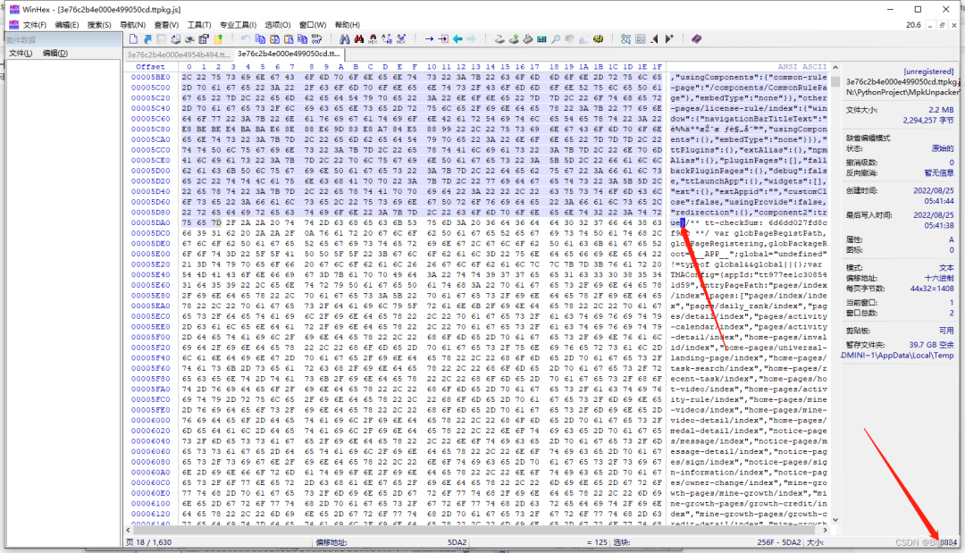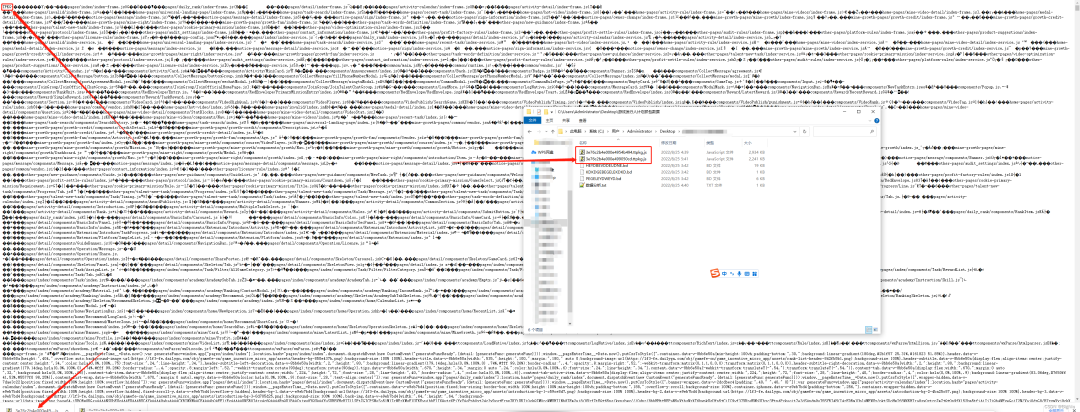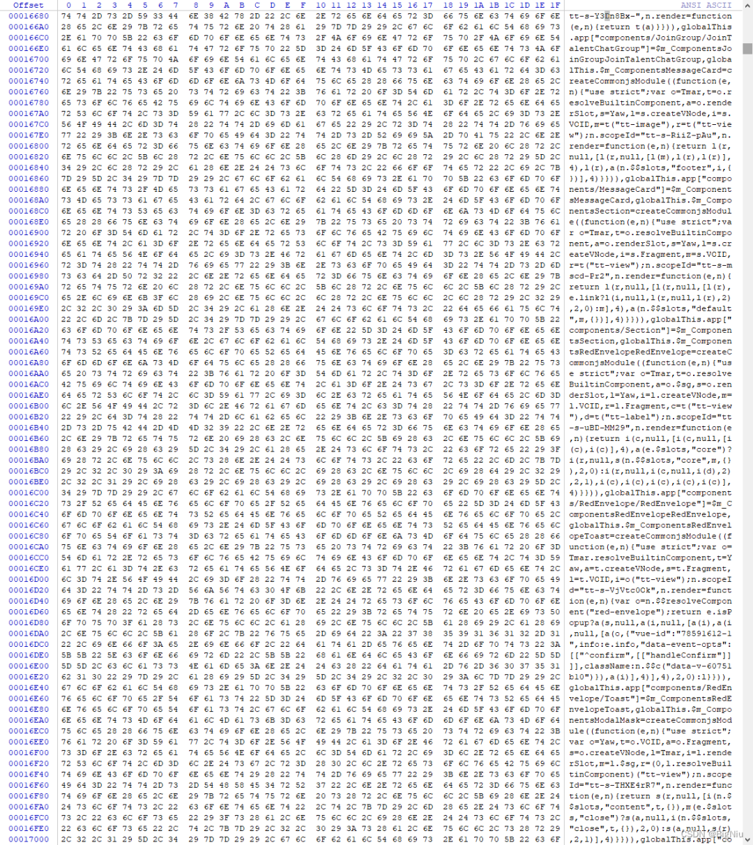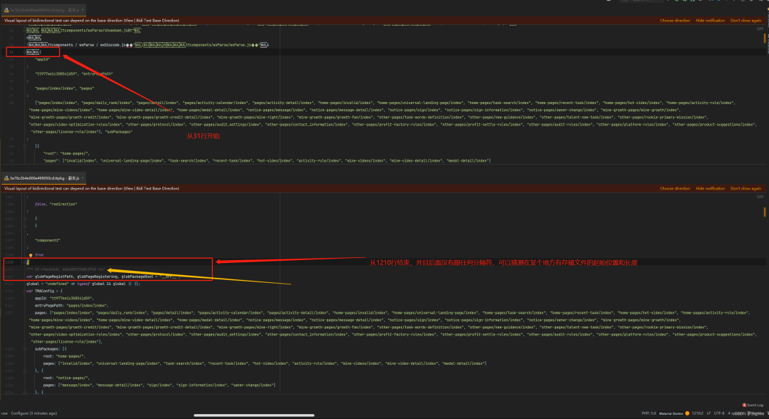 31行有一个json的开始,并且没有乱码之类的,结束的地方在1210行,后面再跟的就是一个js代码的开头了,可以猜测在文件的某个地方存有文件开始位置和结束位置或者文件长度的数据