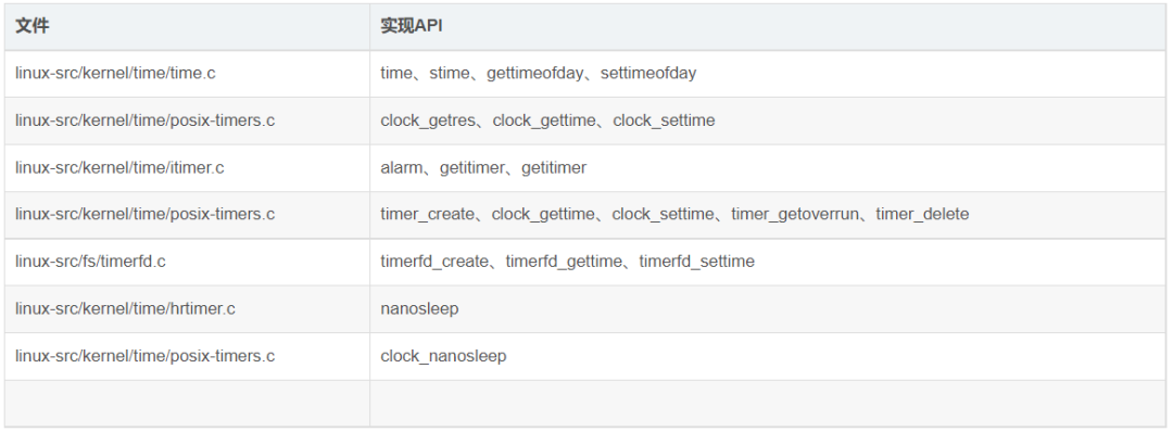 用户空间API的实现文件如下表所示,具体实现细节就不再展开解释了,大家搜索SYSCALL_DEFINE可以快速找到函数实现的地方。