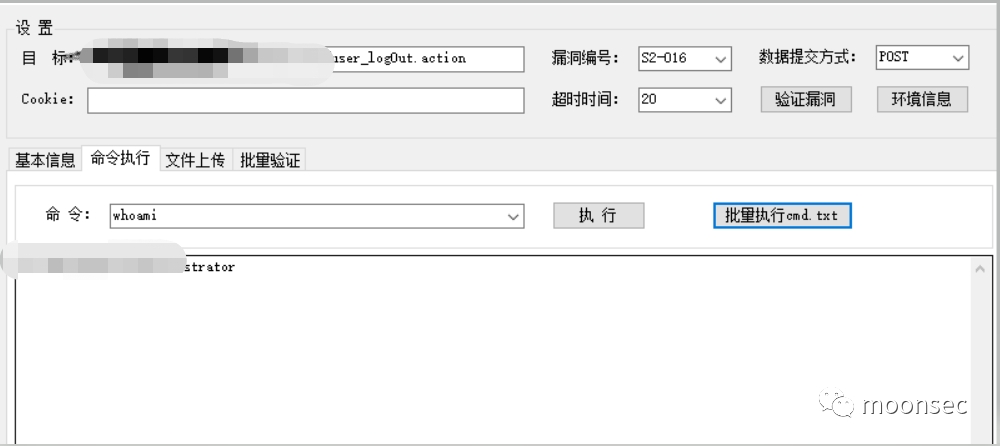 又恰好在我的工具包里有一个2018年的Struts2的exp整合利用包,上去看一下,也还好,可以用S2-016,接下来就是惊心动魄的时候了,输入漏洞存在的路径,选择exp,一键捅穿。