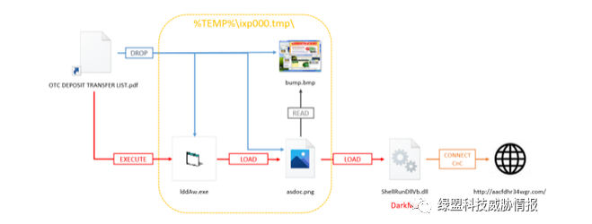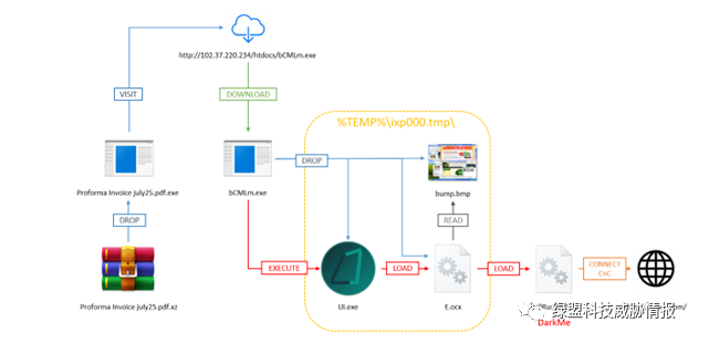 Evilnum是疑似具有白俄罗斯背景的APT组织,以牟取经济利益为目的,自2018年以来一直活跃,主要攻击英国和欧盟国家。该组织的主要行业攻击目标为各类线上交易平台,攻击者通过窃取交易凭证,盗取交易双方账户中的现金。近期,绿盟科技伏影实验室发现攻击者通过网络钓鱼活动,针对线上交易平台开展攻击。攻击者通过将木马隐藏在钓鱼附件中,并诱导受害者执行。随后,远程下载其他阶段的植入物展开进一步攻击。下图是攻击链示意图。