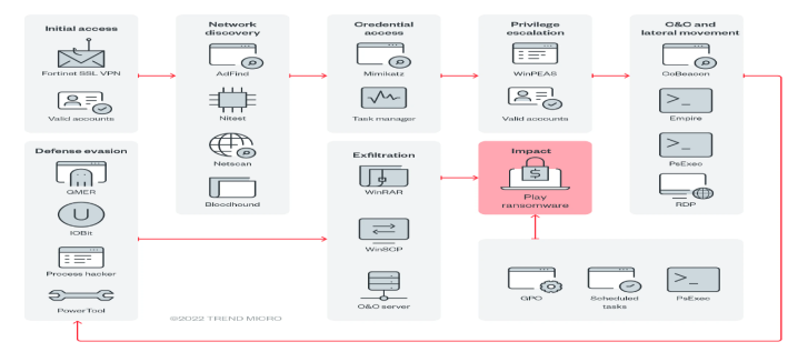 Play是一种新型勒索软件,于2022年6月首次出现,其命名来源于在加密文件后添加了扩展名“.play”,并且使用的赎金记录也还包含一个PLAY”单词。Play勒索软件通过使用被盗的有效帐户或利用未修补的Fortinet SSL VPN漏洞来访问受害者的网络,并创建组策略对象(GPO)完成后续攻击活动。该勒索软件在攻击技术和攻击链两方面与Hive和Nokoyawa勒索软件存在许多相似之处。下图是其感染链。