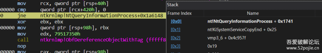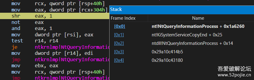 nt!NtQueryInformationProcess+0x1a6260: //符合条件中断,是断在符合条件的代码的下一行