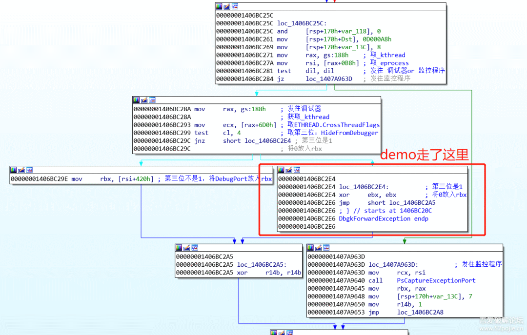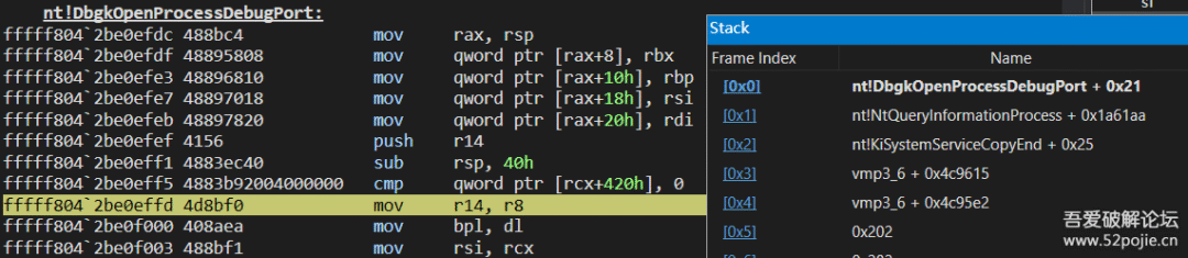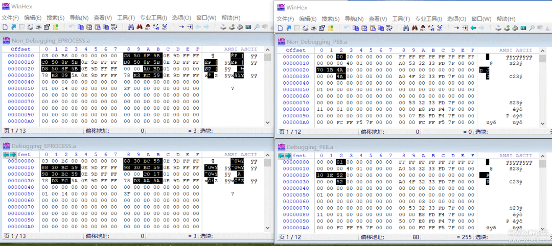 1: kd> eb KdDebuggerNotPresent 1 //排除内核调试器检测干扰1: kd> dt _eprocess ffff9d0e5aad6080 -y debugport //获取debugport偏移