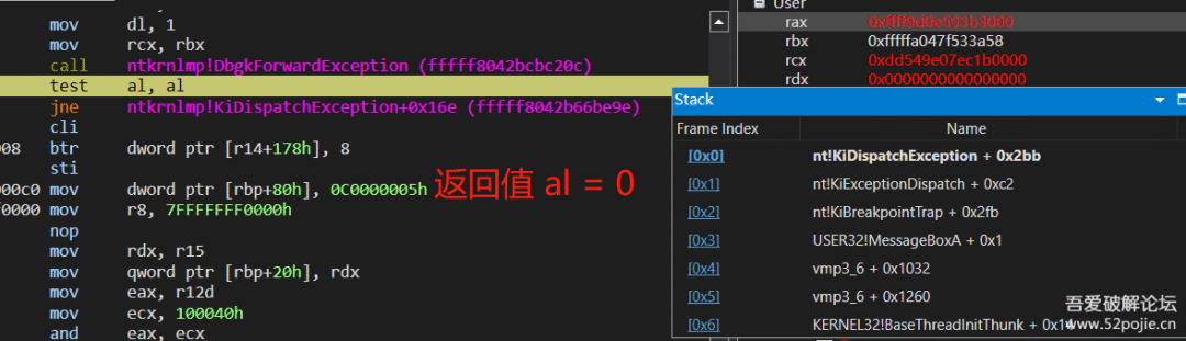 nt!KiDispatchException+0x2bb: //到达这里,看下图