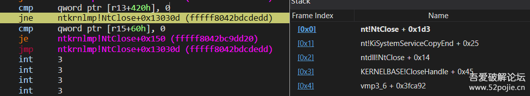 复制代码 隐藏代码 0: kd> bp /p ffff9d0e5aad6080 nt!DbgkForwardException //下条件断点