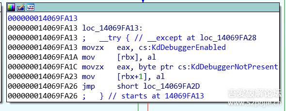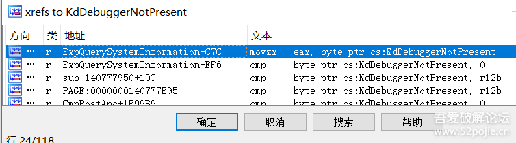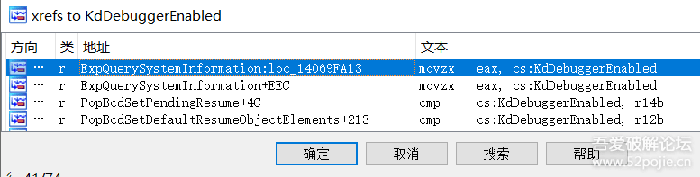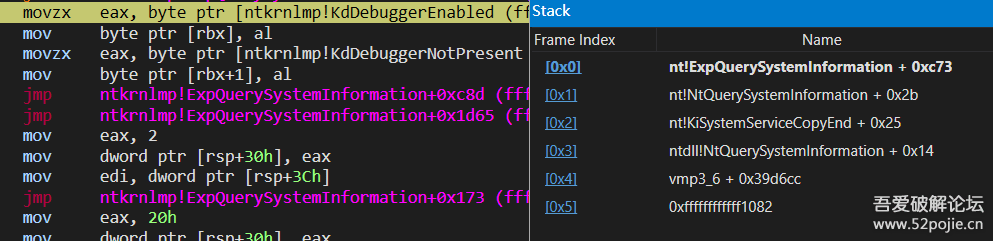 1: kd> ed 3a0a56f000+0xbc 0 //修改NtGlobalFlag为0,排除干扰1: kd> eb KdDebuggerEnabled 0 //排除内核调试器检测干扰