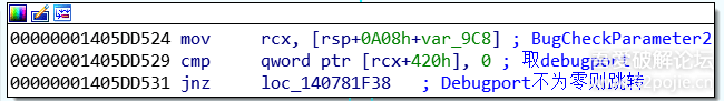 复制代码 隐藏代码 +0x420 DebugPort : Ptr64 Void //调试端口 未调试时为0