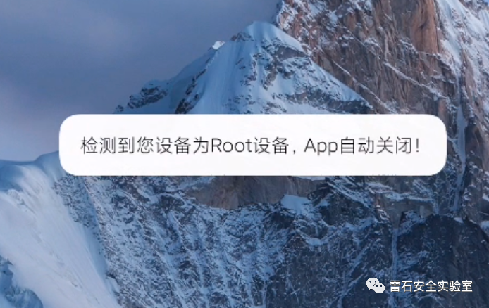 打开app发现提示检测到设备为root设备,闪退。能看到提示,推测应该是java层的检测。