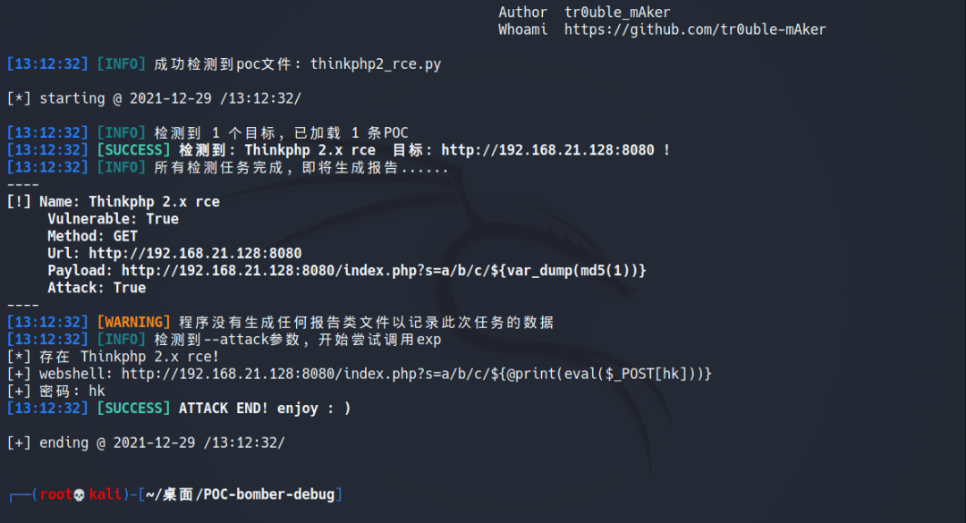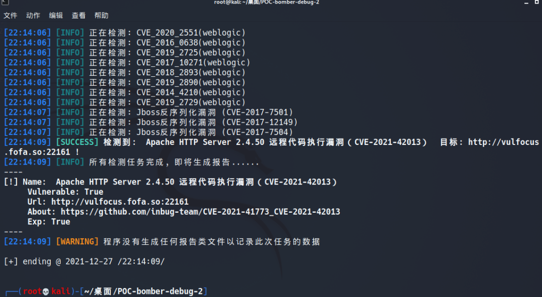 POC bomber的poc支持weblogic,tomcat,apache,jboss,nginx,struct2,thinkphp2x3x5x,spring,redis,jenkins,php语言漏洞,shiro,泛微OA,致远OA,通达OA等易受攻击组件的漏洞检测,支持调用dnslog平台检测无回显的rce(包括log4j2的检测),支持单个目标检测和批量检测,程序采用高并发线程池,支持自定义导入poc/exp,并能够生成漏洞报告。