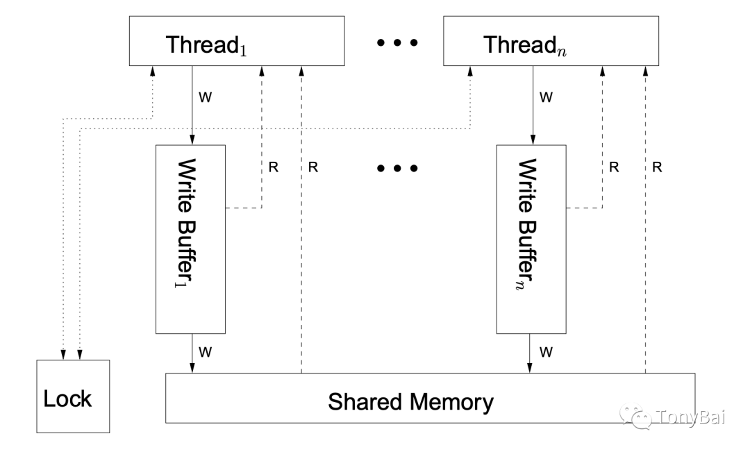 但是这样的机器真的存在吗?并没有,至少在量产的机器中并没有。为什么呢?因为顺序一致性不利于硬件和软件的性能优化。真实世界的共享内存的多处理器计算机的常见机器模型是这样的,也称为Total Store Ordering,TSO模型(图来自《A Tutorial Introduction to the ARM and POWER Relaxed Memory Models》[13]):