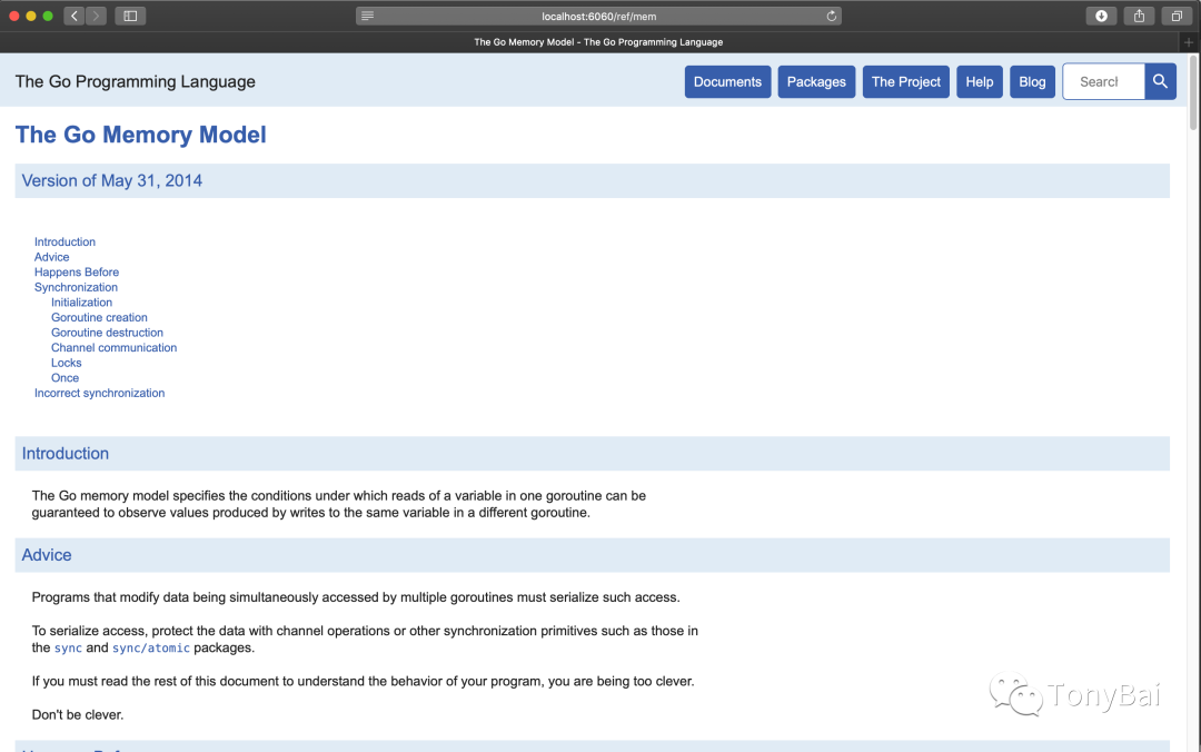 注:查看老版Go内存模型文档的方法:godoc -http=:6060 -goroot /Users/tonybai/.bin/go1.18.3,其中godoc已经不随着go安装包分发了,需要你单独安装,命令为:go install golang.org/x/tools/cmd/godoc。