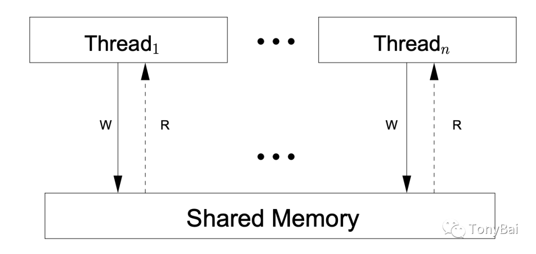 顺序一致性就是一个典型的共享内存、多处理器的内存模型,这个模型保证了所有的内存访问都是以原子方式和按程序顺序进行的。下面是一个共享内存的顺序一致性的抽象机器模型示意图,图来自于《A Tutorial Introduction to the ARM and POWER Relaxed Memory Models》[12] :