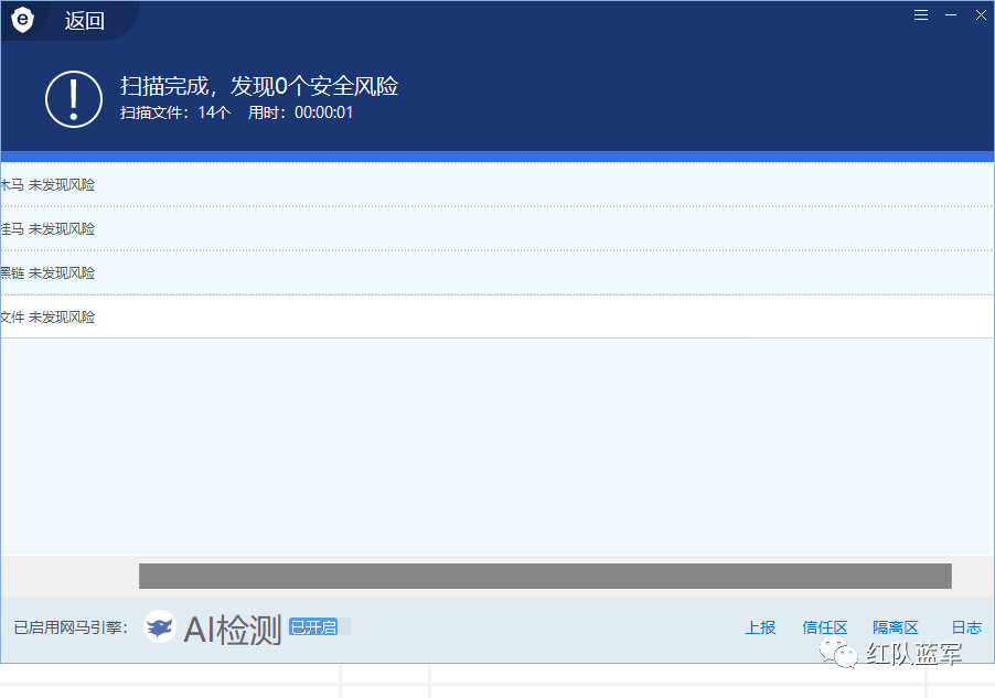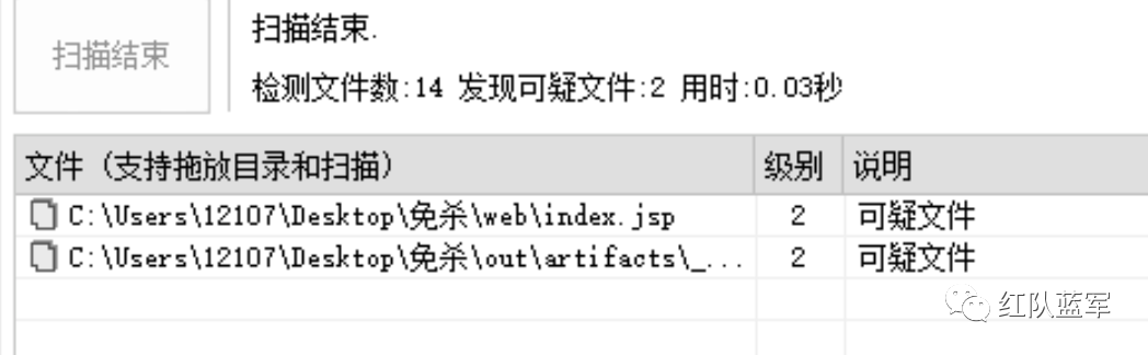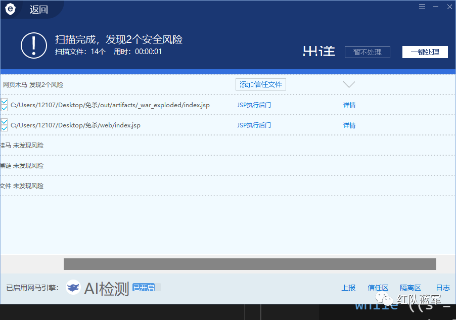 可以看到某盾依旧查杀,经过测试某盾查杀的是当存在反射函数又存在Process类的getInputStream方法时会被查杀,这种情况下,笔者并未找到太好的办法,要么就这些不回显,要么就利用之前文章写的免杀技巧。