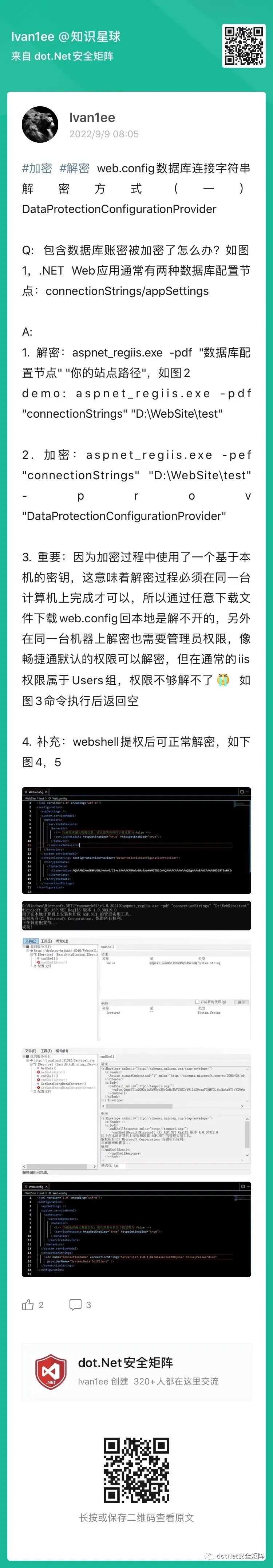近期有师傅反馈拿到了.NET web.config文件,发现数据库连接字符串被加密了,导致看不到MSSQL账户和密码,如下图
