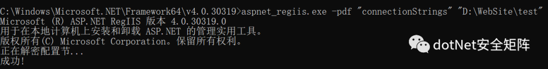 这种加密方式为DataProtectionConfigurationProvider,解密时需要在管理员权限下运行 aspnet_regiis.exe -pdf "connectionStrings" "D:\WebSite\test"