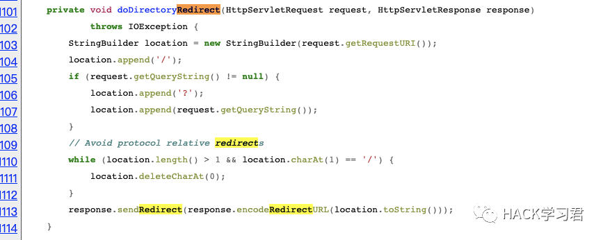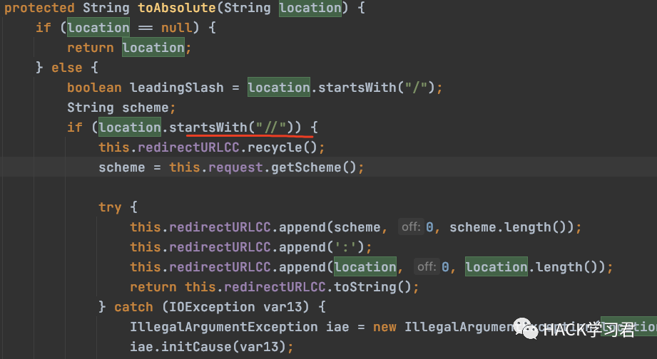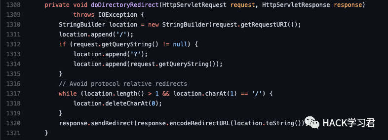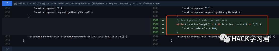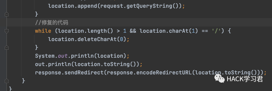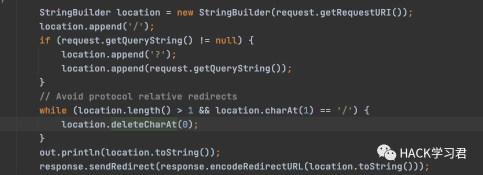 // Avoid protocol relative redirectswhile (location.length() > 1 && location.charAt(1) == '/') {location.deleteCharAt(0);}