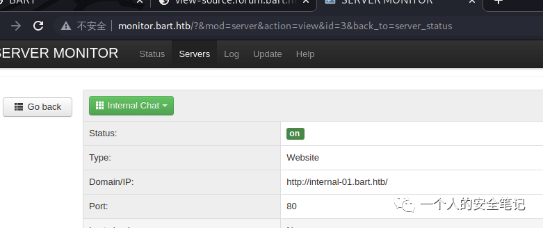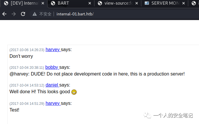 使用 Nmap 枚举目标服务器开放端口时发现仅存在80端口,使用子域名枚举发现存在 monitor.bart.htb 子站,对 forum.bart.htb 的信息进行收集构建枚举字典,通过字典碰撞成功登陆系统后台并找到新的 internal-01.bart.htb 站点。