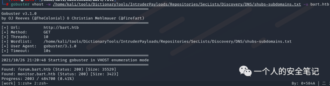 怀疑目录枚举可能不会有收获,改为使用 gobuster 工具的 vhost 功能枚举子域名: