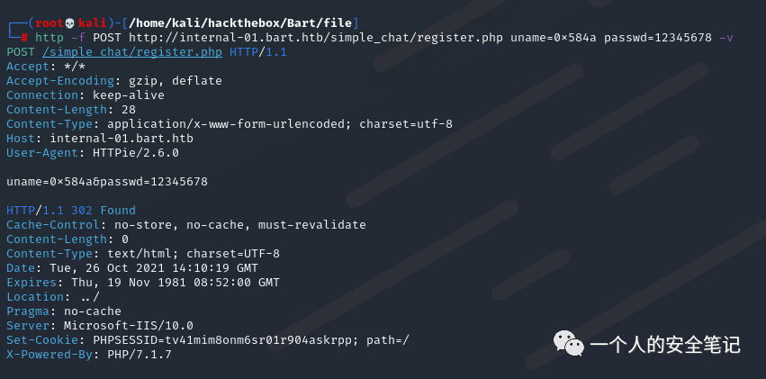 简单的请求 HTTP 服务,返回 302 页面重定向至 forum.bart.htb 域名,并且可以看到 php 7.17 的版本指纹。
