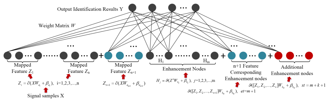 为了解决上述问题,本方案首先提出了一种基于自适应宽度学习的轻量级辐射源个体识别模型。相较于深度,宽度学习的结构是一种根本性的颠覆,它可以有效解决深度学习的固有缺陷:其结扁平形的设计可以避免过量的冗余节点,降低了需要计算的参数量;使用伪逆求解权重,过程是一步到位,避免了深度学习方法的反复迭代求解权重参数;其架构是可扩展的,当需要新增节点时,可以通过已有权重计算新的权重,从而避免了场景更新后需要重新训练模型的问题。本方案提出的自适应的宽度学习方案进一步解决了传统宽度学习需要人工确定特征节点和增强节点的问题,优化了模型构建需要调参的问题。