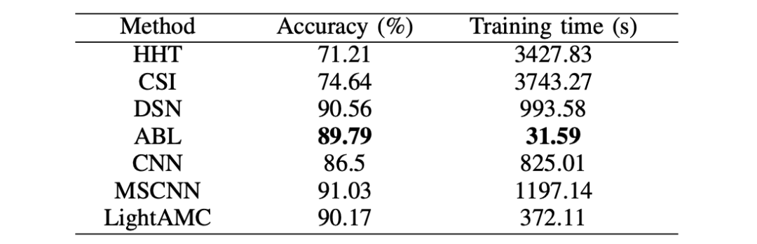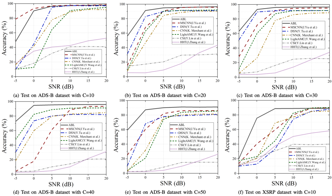 本方案将提出的ABL方法的性能与其他四种最先进的基于深度学习的SEI方法进行了比较,分别为轻量级自动调制分类(Lightweight Automatic Modulation Classification, LightAMC)、深度信号网络(Deep Signal Network, DSN)、多采样卷积神经网络(Multi-Sampling Convolutional Neural Network, MSCNN)和卷积神经网络(Convolutional Neural Network, CNN)。此外,选取了两种基于手动特征提取的SEI方法,即希尔伯特黄变换 (Hilbert–Huang Transform, HHT)和等势星座图(Contour Stella Image, CSI)用作对比方法以进一步验证本方案方法的优越性。