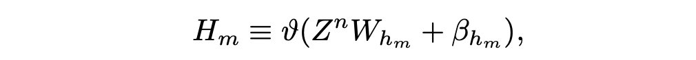 其中δ(*)为sigmoid激活函数,这里需要注意的是,根据信号的特征不同,可以选择不同类型的激活函数。此外,δ(*)可以为不同类型的激活函数。Whm和βhm是以随机方式产生的权重和偏置。