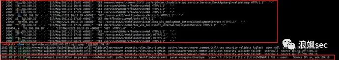 查看中间件,发现同样存在攻击事件,利用的是泛微OA WorkflowServiceXml远程代码执行漏洞。发现第三个攻击者IP。