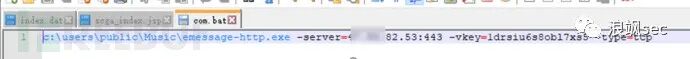 在c盘的用户/公用,目录下找到恶意文件运行的脚本,并且打开后可以看到这个脚本在调用emessage-http.exe工具,并且回连到恶意IP,找到第六个攻击IP。以及通过PsExec64.exe进行提权操作。