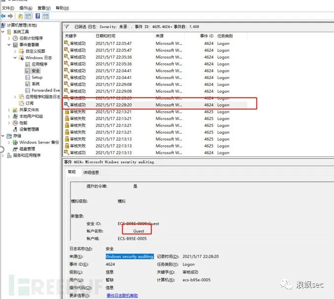 查看服务器系统日志,5月17日晚10点12开始出现大量guest登录失败以及登录成功事件