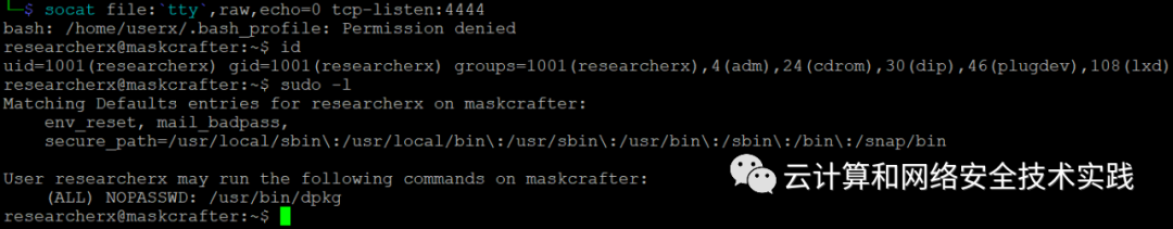 就拿到了researcherx账户shell,sudo -l确认/usr/bin/dpkg有root权限,