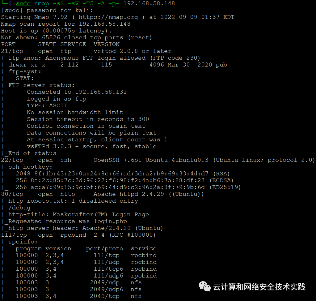 继续进行端口扫描,sudo nmap -sS -sV -T5 -A -p- 192.168.58.148,