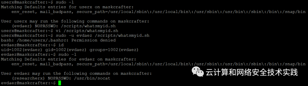 sudo -u evdaez /scripts/whatsmyid.sh,进入evdaez账户shell,