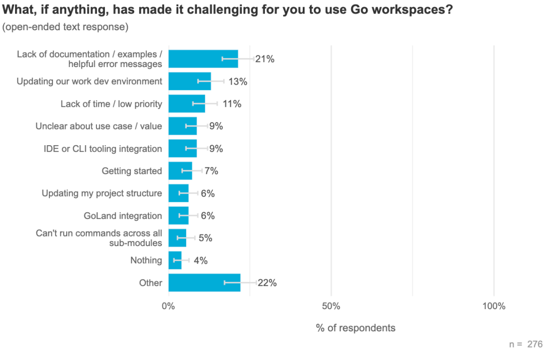 我们还发现,有 9% 的受访者曾经试用过工作区,另有 5% 表示想要尝试但最终未能进行。关于使用 Go 工作区的阻碍,位居榜首的是 go work 命令缺乏说明文档和有意义的错误消息(21%),其次则是要求重构现有 repo(13%)。与安全部分的讨论类似,同样有不少受访者给出了“没时间 / 不是优先事项”之类的理由。按照我们的理解,这意味着跟实际带来的收益相比,工作区的理解和设置门槛仍然偏高,也可能是开发者之前就已经找到了自己的解决办法。